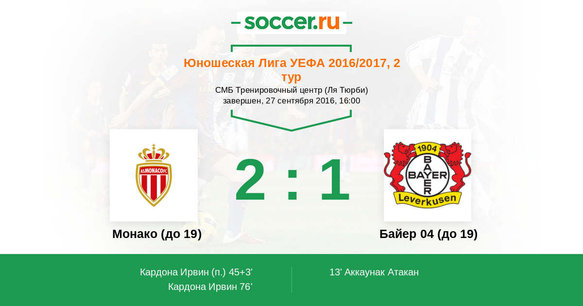 Протокол матча Монако (до 19) против Байер 04 (до 19)