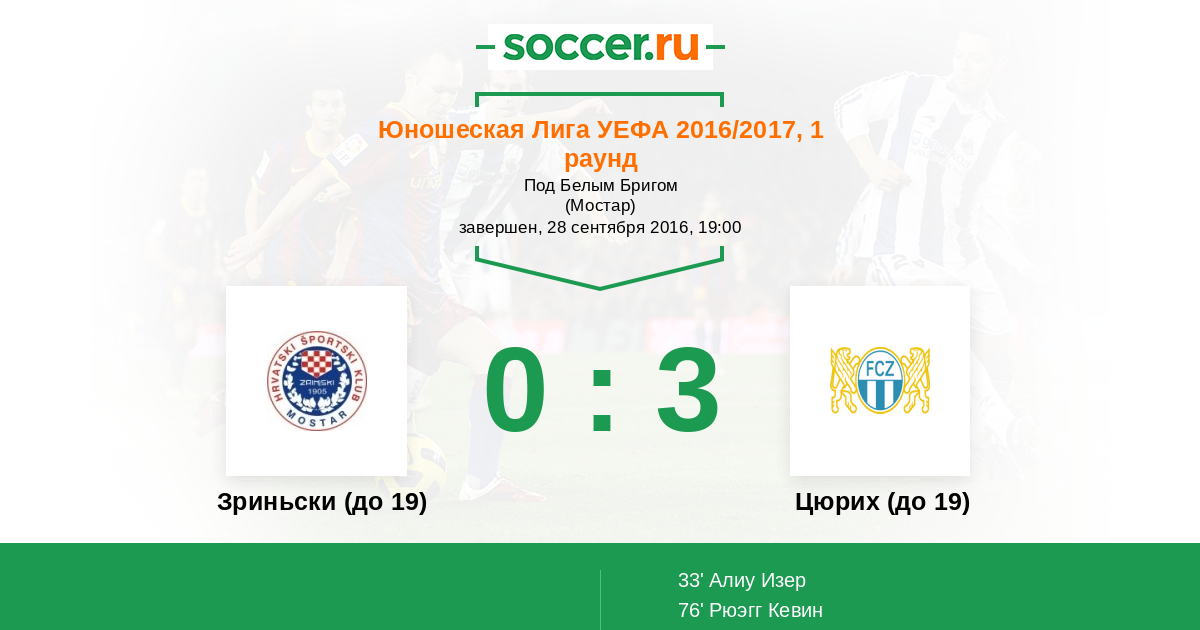 Протокол матча Зриньски (до 19) против Цюрих (до 19)