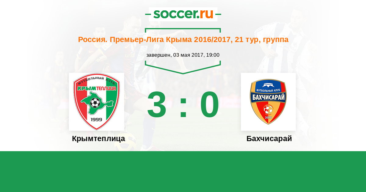 Россия. Премьер-Лига Крыма 03.05.2017 Крымтеплица Логотип футбольный клуб Крымтеплица (Молодежное) 3:0 Логотип футбольный клуб Бахчисарай Бахчисарай