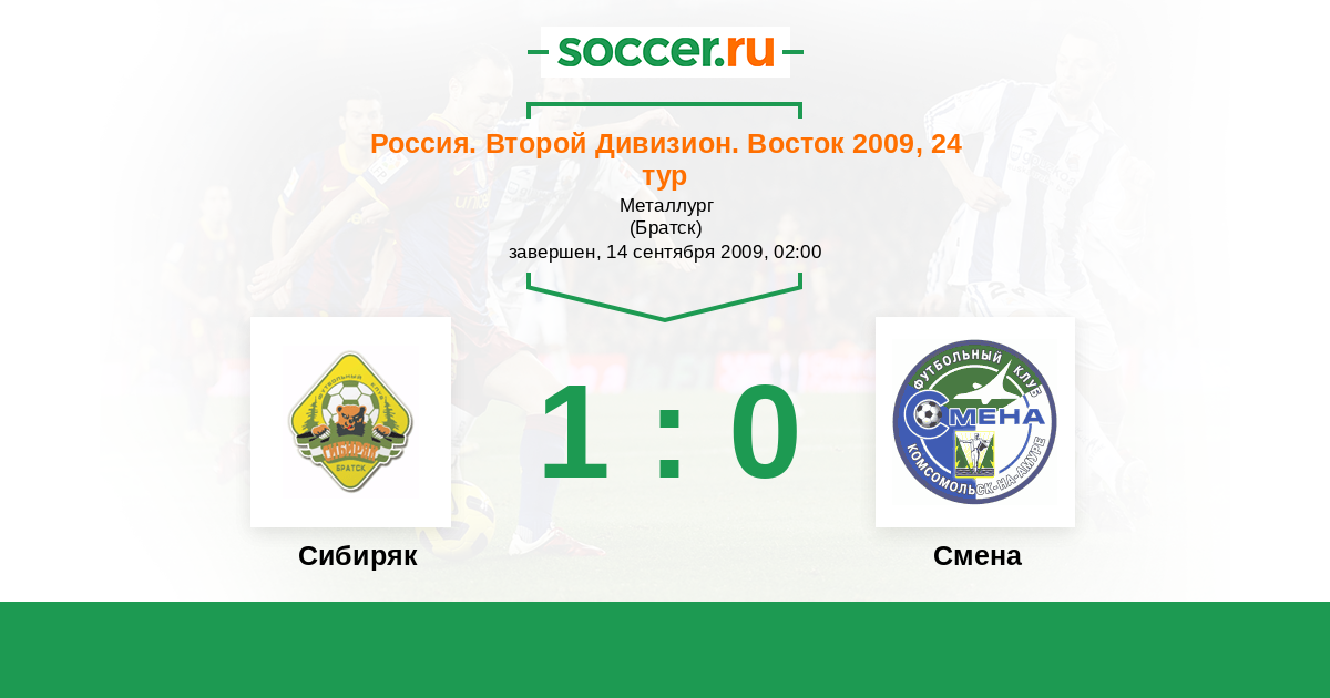 Россия. 2-й дивизион. Восток 26.06.2009 Смена Логотип футбольный клуб Смена (Комсомольск-на-Амуре) 4:0 Логотип футбольный клуб Сибиряк (Братск) Сибиряк