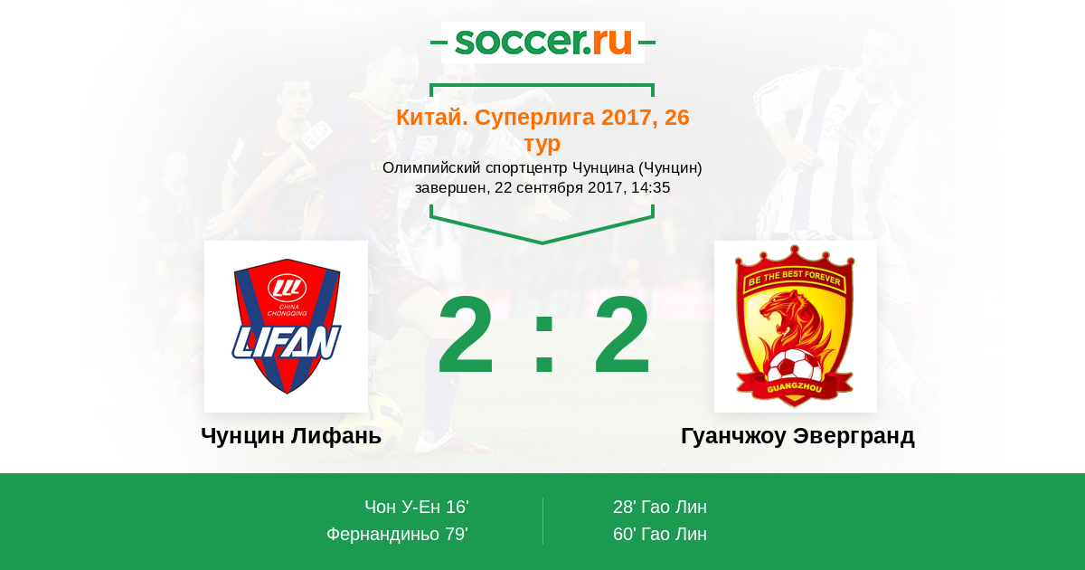 Протокол матча Чунцин Лифань против Гуанчжоу Эвергранд