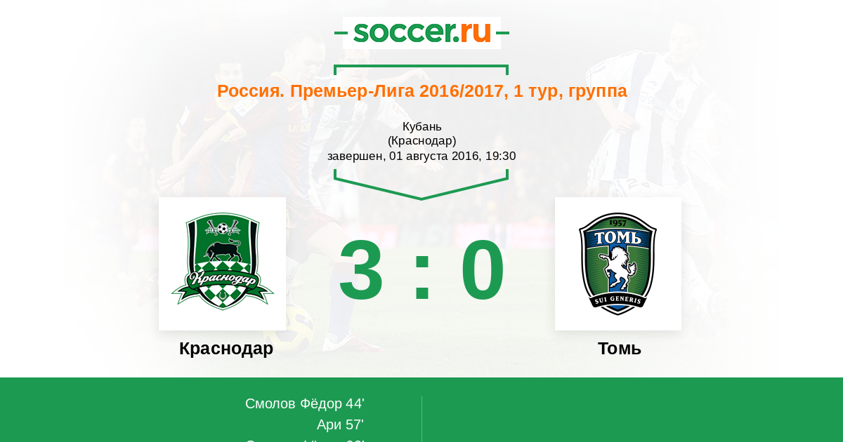 Протокол матча Краснодар против Томь