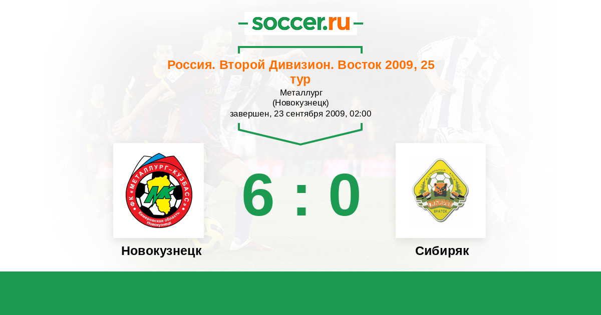 Россия. 2-й дивизион. Восток 05.07.2009 Сибиряк Логотип футбольный клуб Сибиряк (Братск) 2:1 Логотип футбольный клуб Металлург-Кузбасс (Новокузнецк) Металлург-Кузбасс