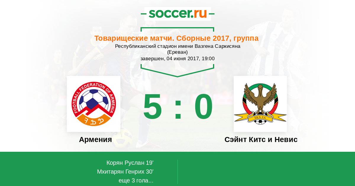 Соперник давал играть конечно...Первый гол забил Руслан Корян, второй и третий Генрих Мхитарян, четвёртый гол забил Артур Саркисов, пятый Артак Едигарян.
