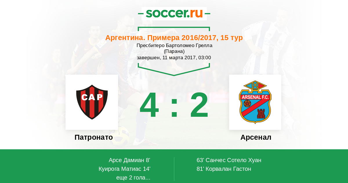 Протокол матча Патронато против Арсенал