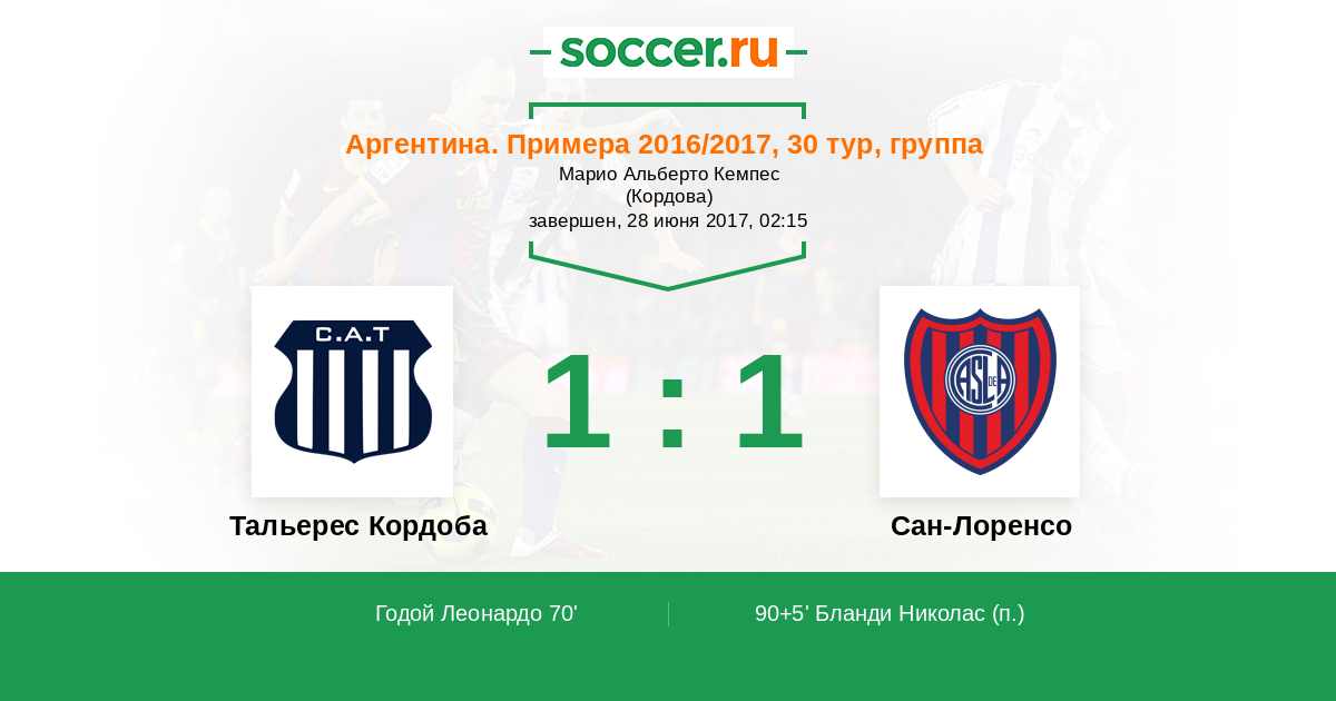 Протокол матча Тальерес Кордоба против Сан-Лоренсо