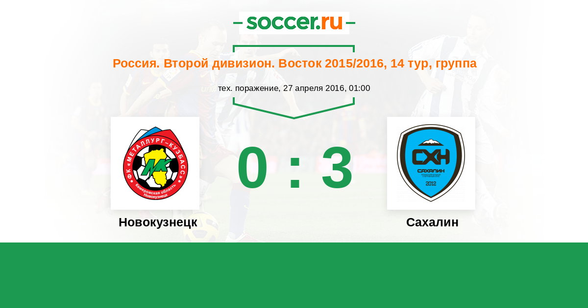 Россия. 2-й дивизион. Восток 27.04.2016 Новокузнецк Логотип футбольный клуб Новокузнецк 0:3 Логотип футбольный клуб Сахалин (Южно-Сахалинск) Сахалин