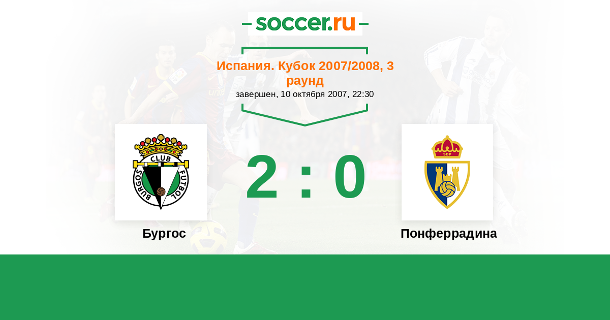 Испания. Сегунда Б: Группа 1 20.01.2008 Понферрадина Логотип футбольный клуб Понферрадина 0:1 Логотип футбольный клуб Бургос Бургос