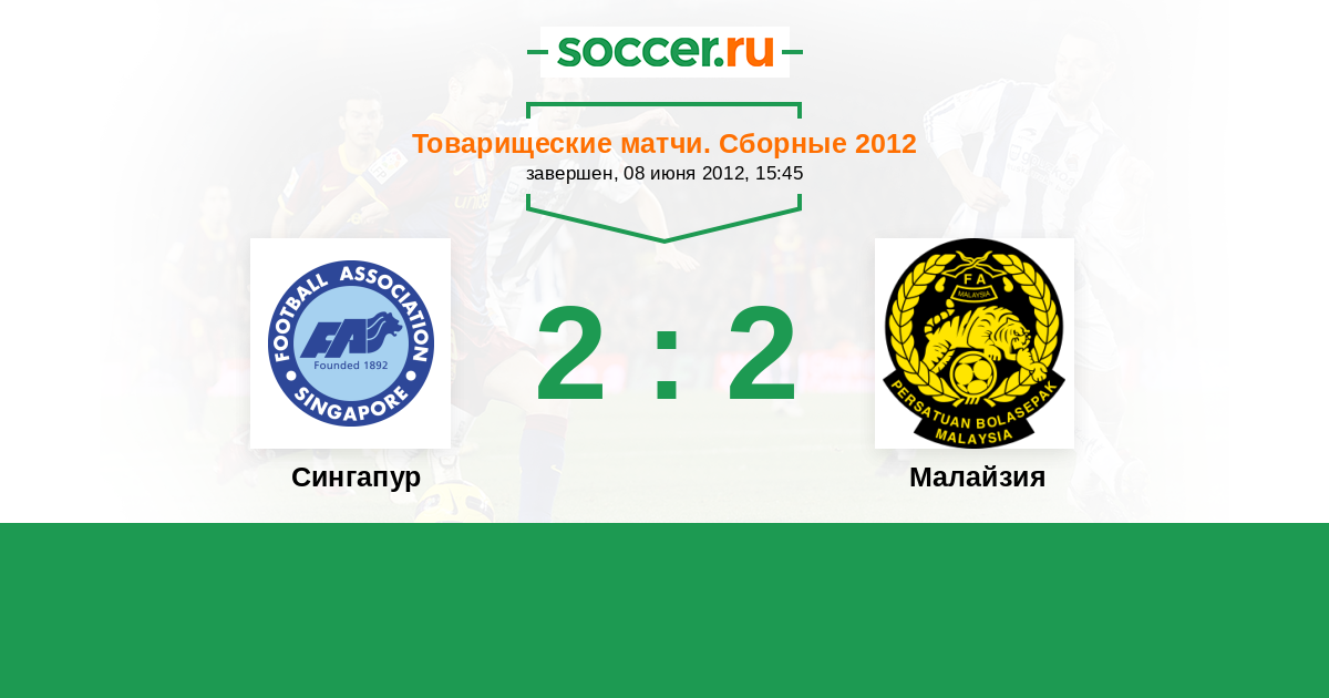 Товарищеские матчи. Сборные 12.06.2012 Малайзия Логотип Малайзия 2:0 Логотип Сингапур Сингапур