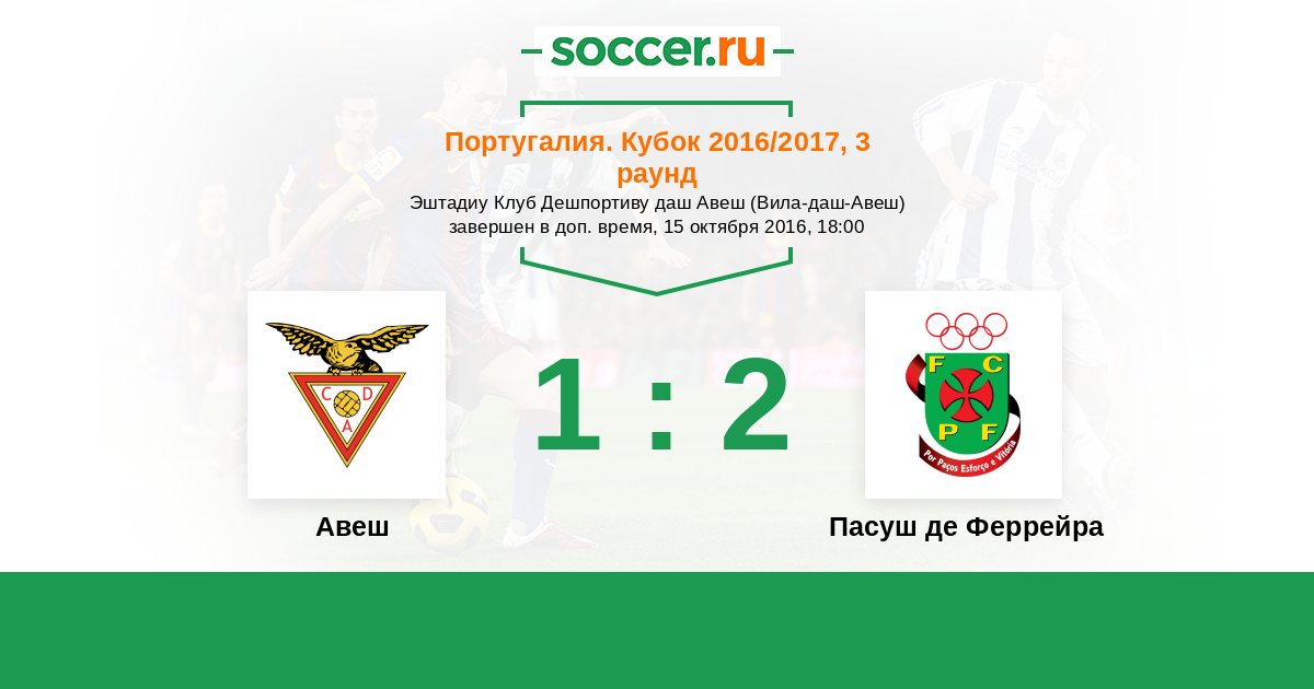 Португалия. Кубок Португальской лиги 15.09.2018 Пасуш де Феррейра Логотип футбольный клуб Пасуш де Феррейра 0:0 Логотип футбольный клуб Авеш (Вила-даш-Авеш) Авеш