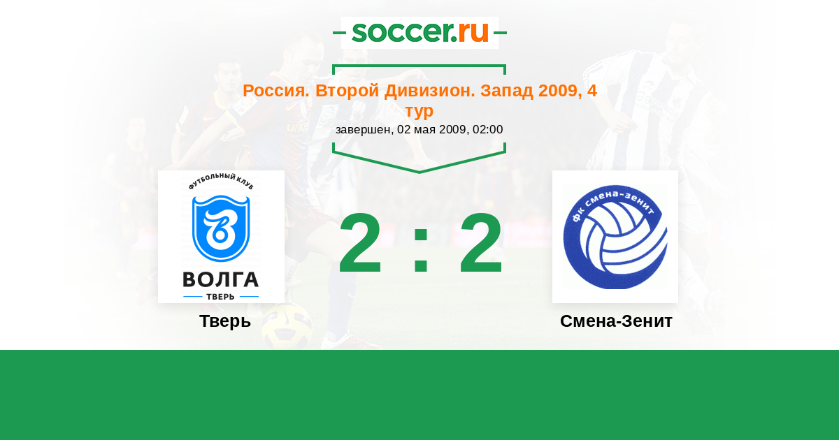 Россия. Вторая лига. Группа 2 15.08.2009 Смена-Зенит Логотип футбольный клуб Смена-Зенит (Санкт-Петербург) 2:1 Логотип футбольный клуб Тверь Тверь