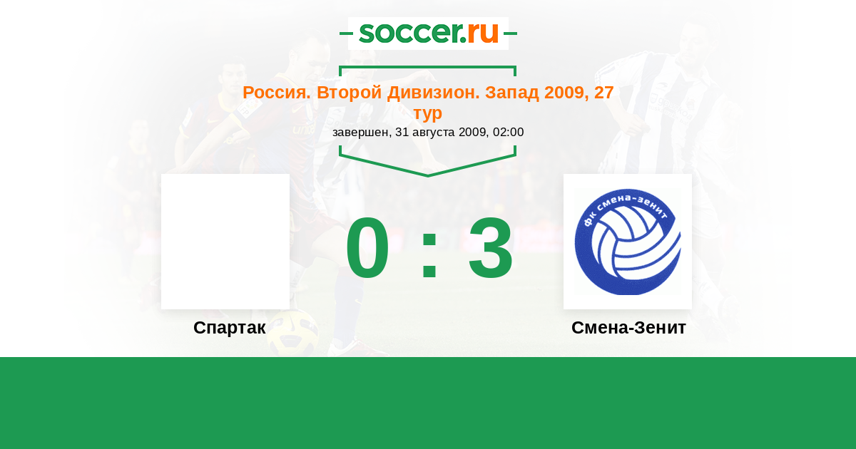 Россия. Вторая лига. Группа 2 31.10.2009 Локомотив-2 Логотип футбольный клуб Локомотив-2 (Москва) 0:2 Логотип футбольный клуб Смена-Зенит (Санкт-Петербург) Смена-Зенит
