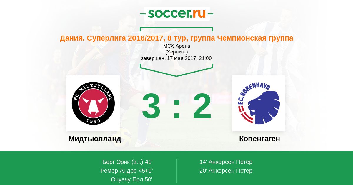 41' (1:2) Автогол Берг Эрик (5)