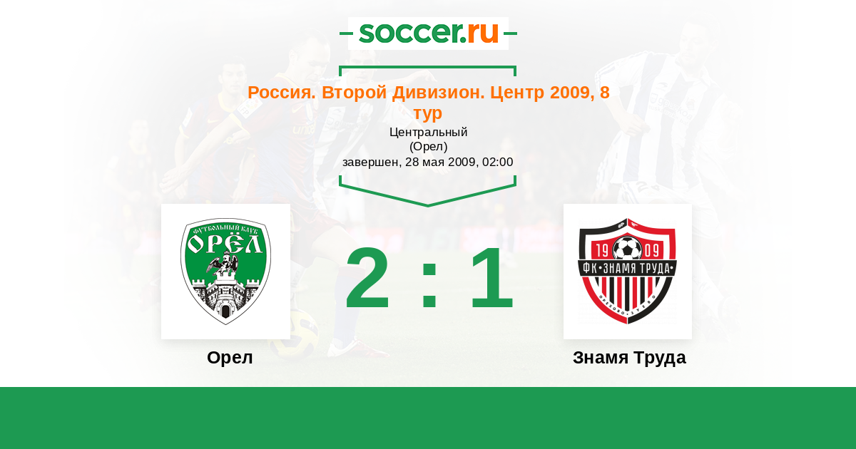 Россия. Вторая лига. Группа 3 27.08.2009 Знамя Труда Логотип футбольный клуб Знамя Труда (Орехово-Зуево) 0:1 Логотип футбольный клуб Орел Орел