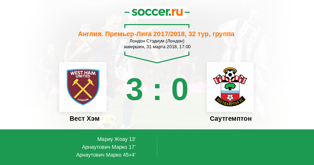 Протокол матча Вест Хэм против Саутгемптон