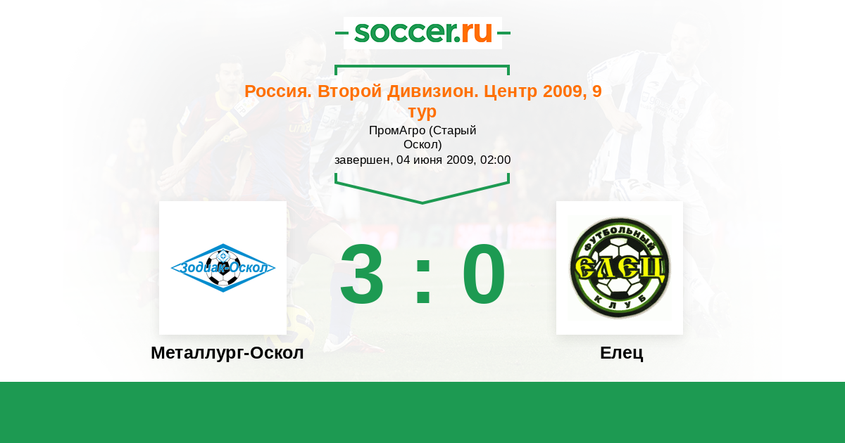Россия. Вторая лига. Группа 3 04.09.2009 Елец Логотип футбольный клуб Елец 0:3 Логотип футбольный клуб Металлург-Оскол (Старый Оскол) Металлург-Оскол