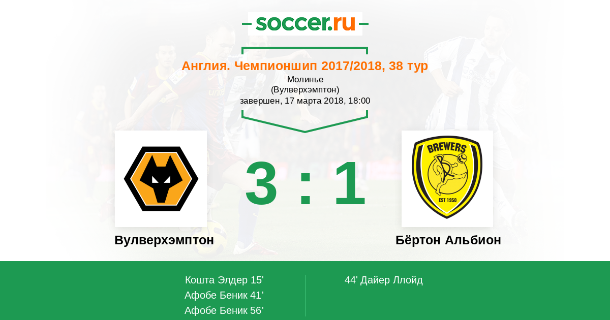 Протокол матча Вулверхэмптон против Бёртон Альбион
