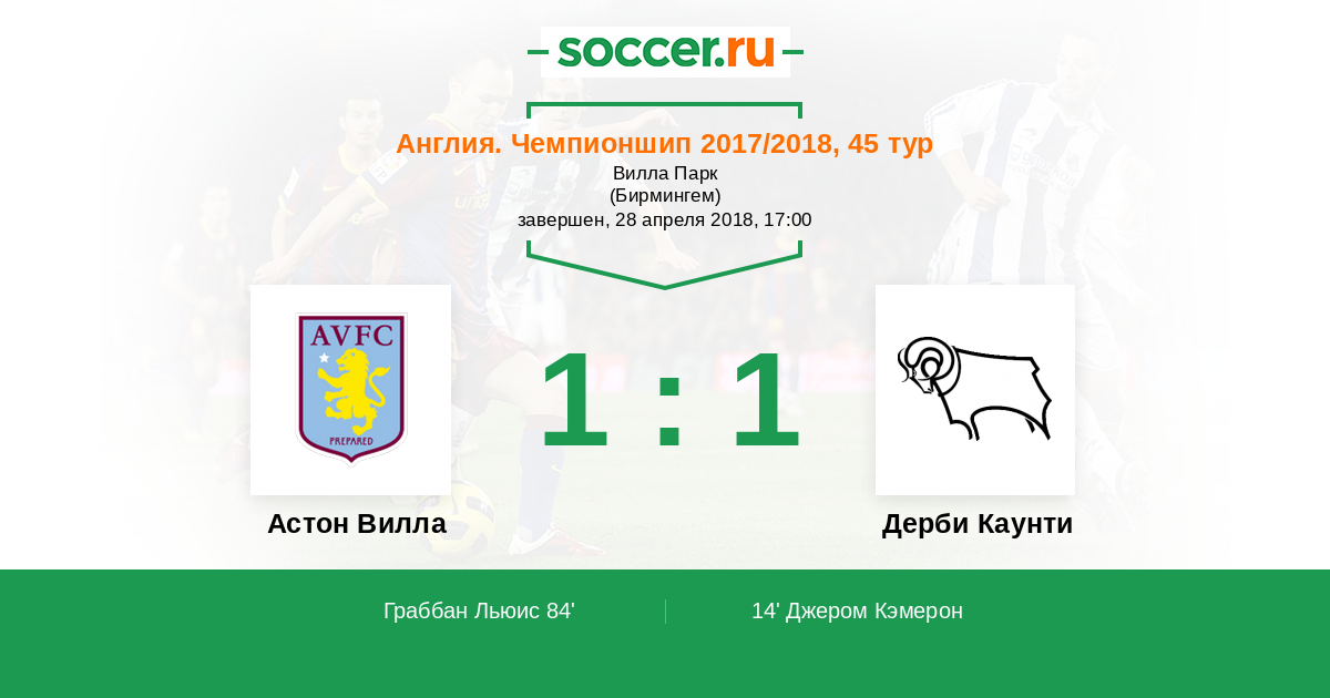 Протокол матча Астон Вилла против Дерби Каунти