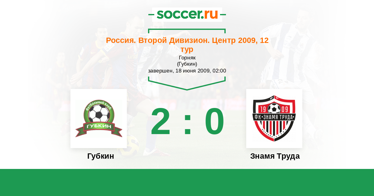 Россия. Вторая лига. Группа 3 17.09.2009 Знамя Труда Логотип футбольный клуб Знамя Труда (Орехово-Зуево) 0:3 Логотип футбольный клуб Губкин Губкин