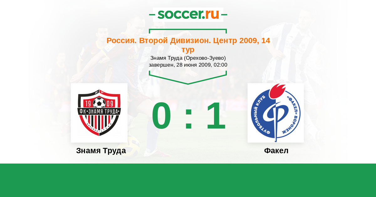 Россия. Вторая лига. Группа 3 28.09.2009 Факел Логотип футбольный клуб Факел (Воронеж) 0:3 Логотип футбольный клуб Знамя Труда (Орехово-Зуево) Знамя Труда