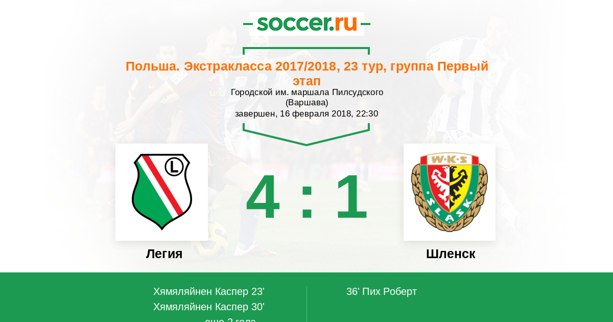 Протокол матча Легия против Шленск
