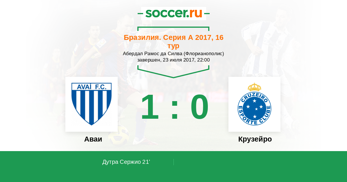 21' (1:0) Дутра Сержио (9) (Леандро Силва (2))