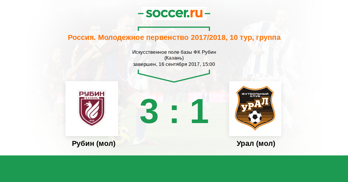 Россия. Премьер-Лига U21 26.09.2015 Рубин (мол) Логотип футбольный клуб Рубин (мол) (Казань) 3:0 Логотип футбольный клуб Урал (мол) (Екатеринбург) Урал (мол)