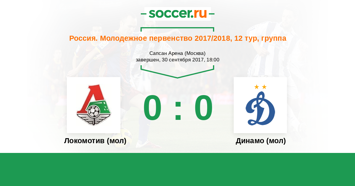 Россия. Премьер-Лига U21 14.09.2018 Локомотив (мол) Логотип футбольный клуб Локомотив (мол) (Москва) 0:2 Логотип футбольный клуб Динамо (мол) (Москва) Динамо (мол)