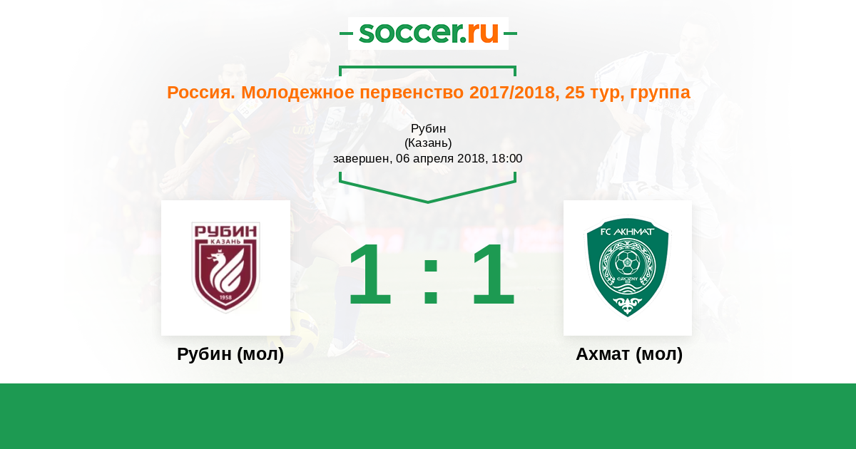 Россия. Премьер-Лига U21 25.09.2017 Ахмат (мол) Логотип футбольный клуб Ахмат (мол) (Грозный) 3:2 Логотип футбольный клуб Рубин (мол) (Казань) Рубин (мол)