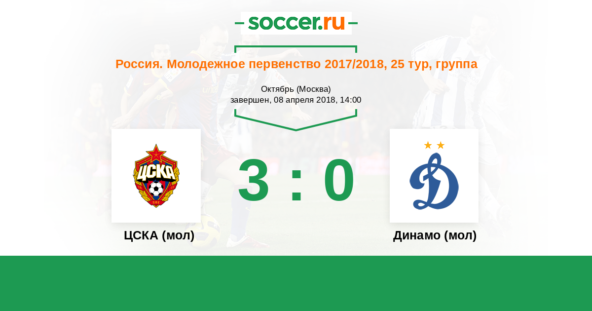 Россия. Премьер-Лига U21 22.09.2017 Динамо (мол) Логотип футбольный клуб Динамо (мол) (Москва) 2:1 Логотип футбольный клуб ЦСКА (мол) (Москва) ЦСКА (мол)