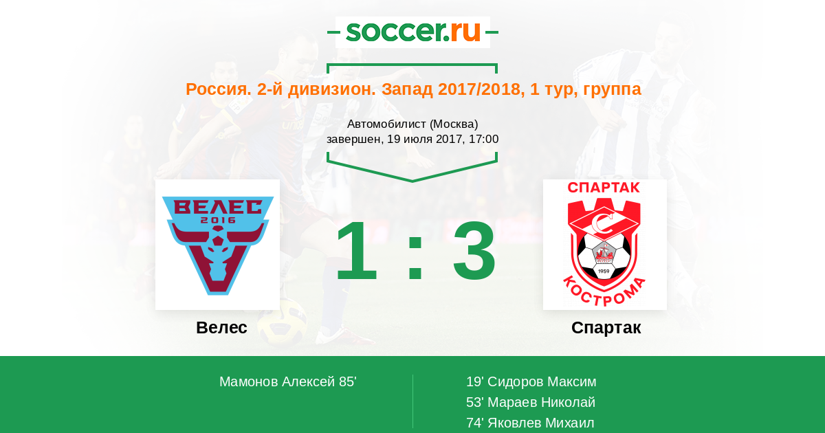 Протокол матча Велес против Спартак Кострома