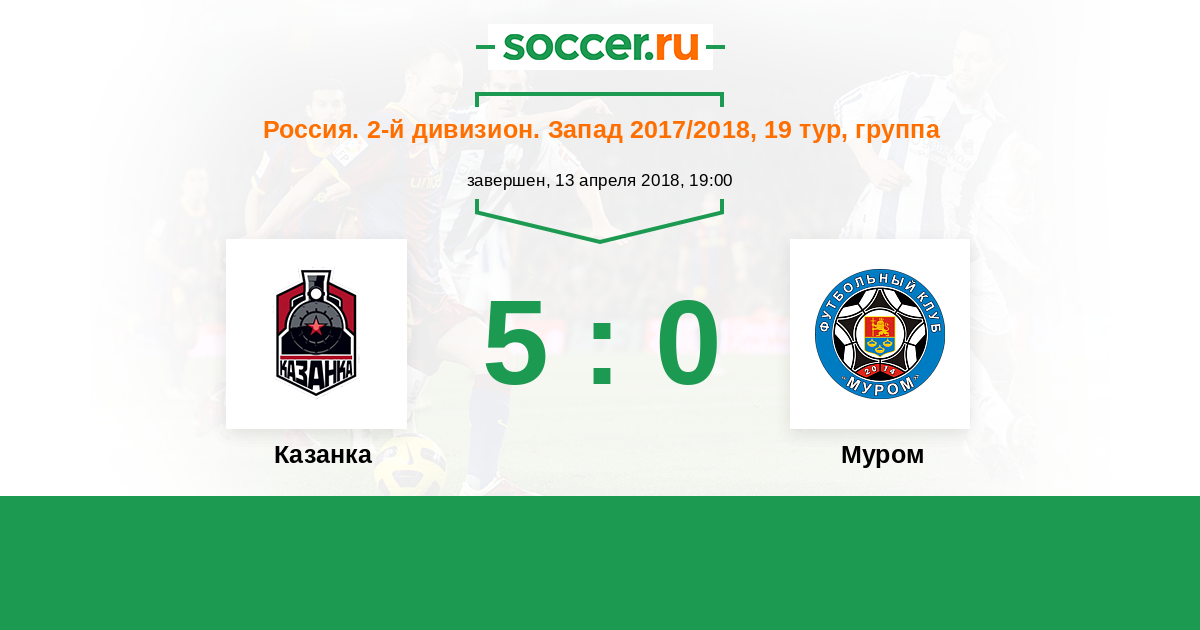Россия. Вторая лига. Группа 2 13.04.2019 Казанка Логотип футбольный клуб Казанка (Москва) 5:0 Логотип футбольный клуб Муром Муром