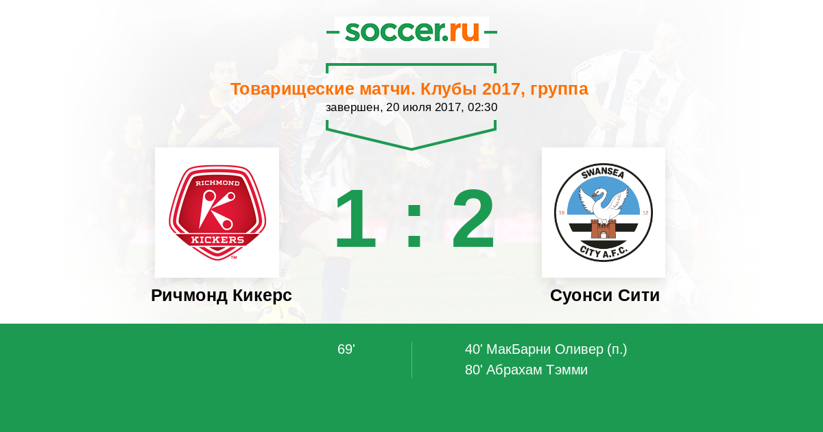 Протокол матча Ричмонд Кикерс против Суонси Сити