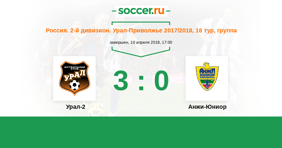 Россия. Вторая лига. Группа 4 10.04.2018 Урал-2 Логотип футбольный клуб Урал-2 (Екатеринбург) 3:0 Логотип футбольный клуб Анжи-Юниор (Зеленодольск) Анжи-Юниор