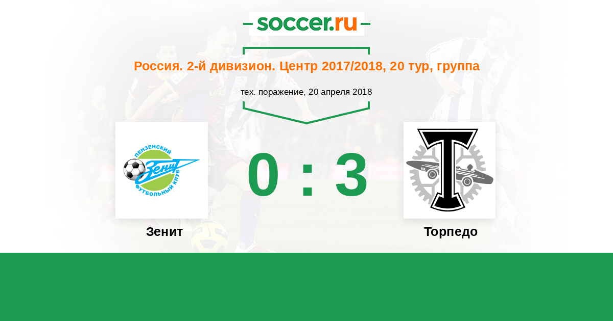 Россия. Вторая лига. Группа 3 09.04.2017 Торпедо Логотип футбольный клуб Торпедо (Москва) 4:0 Логотип футбольный клуб Зенит (Пенза) Зенит