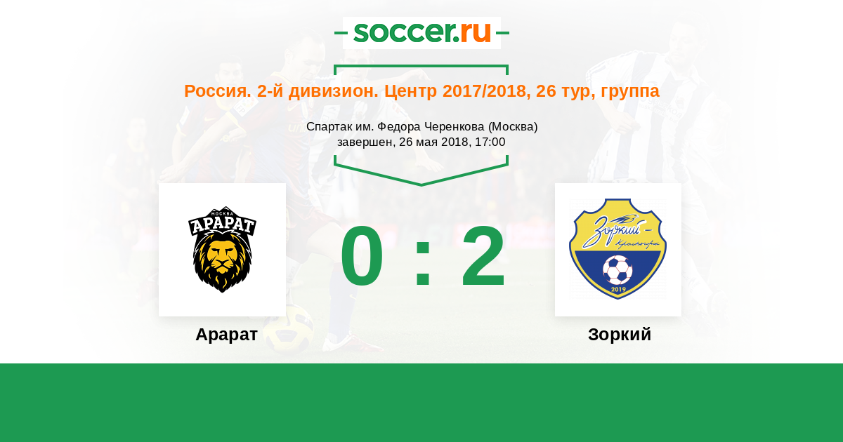 Россия. Вторая лига. Группа 3 19.07.2017 Зоркий Логотип футбольный клуб Зоркий (Красногорск) 0:3 Логотип футбольный клуб Арарат (Москва) Арарат