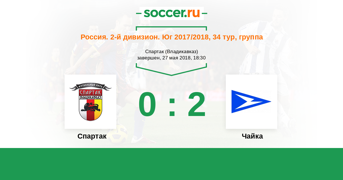 Россия. Вторая лига. Группа 1 20.07.2017 Чайка Логотип футбольный клуб Чайка (Песчанокопское) 1:0 Логотип футбольный клуб Спартак (Владикавказ) Спартак