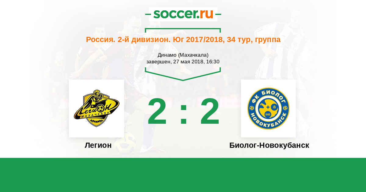 Россия. Вторая лига. Группа 1 20.07.2017 Биолог-Новокубанск Логотип футбольный клуб Биолог-Новокубанск 0:1 Логотип футбольный клуб Легион (Махачкала) Легион