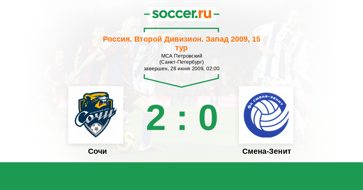 Россия. Вторая лига. Группа 2 09.10.2009 Смена-Зенит Логотип футбольный клуб Смена-Зенит (Санкт-Петербург) 0:1 Логотип футбольный клуб Динамо (Сочи) Динамо