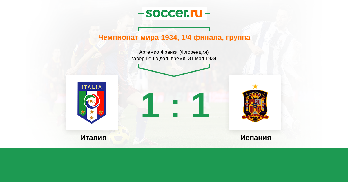 Чемпионат мира 01.06.1934 Италия Логотип Италия 1:0 Логотип Испания Испания