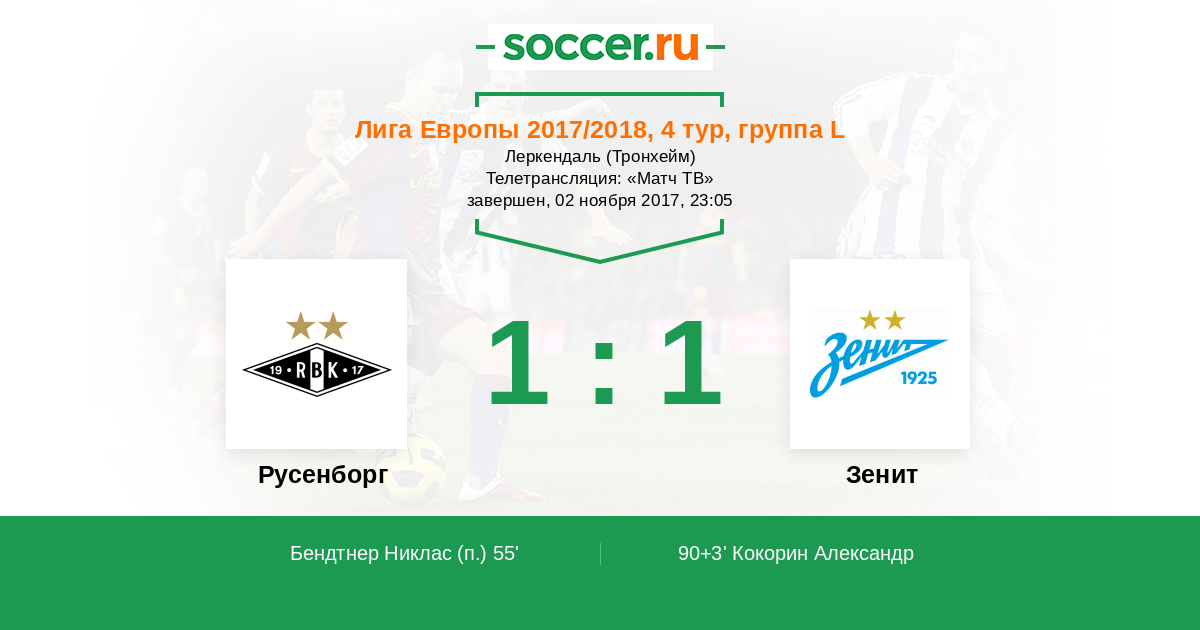 Протокол матча Русенборг против Зенит