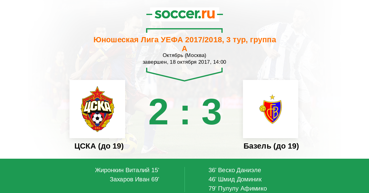 Протокол матча ЦСКА (до 19) против Базель (до 19)