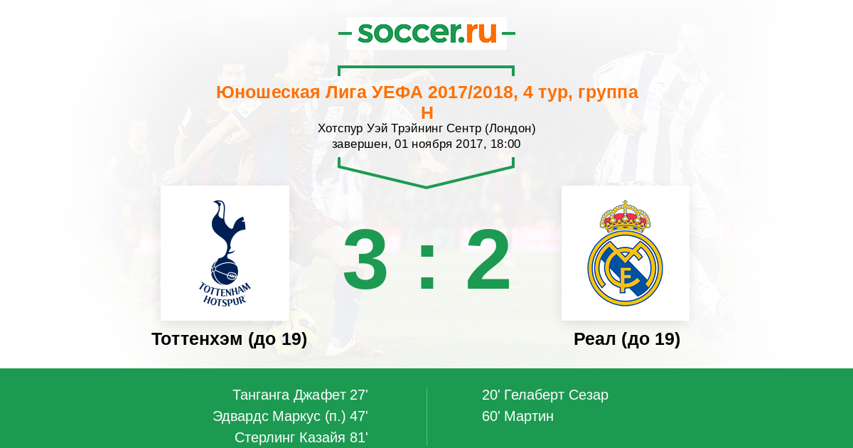 Протокол матча Тоттенхэм (до 19) против Реал (до 19)