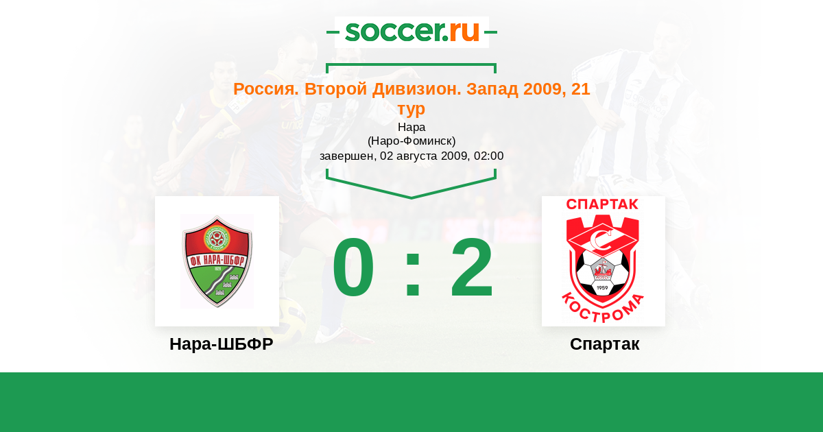 Россия. Вторая лига. Группа 2 16.09.2010 Спартак Кострома   1:2 Логотип футбольный клуб Нара-ШБФР (Наро-Фоминск) Нара-ШБФР