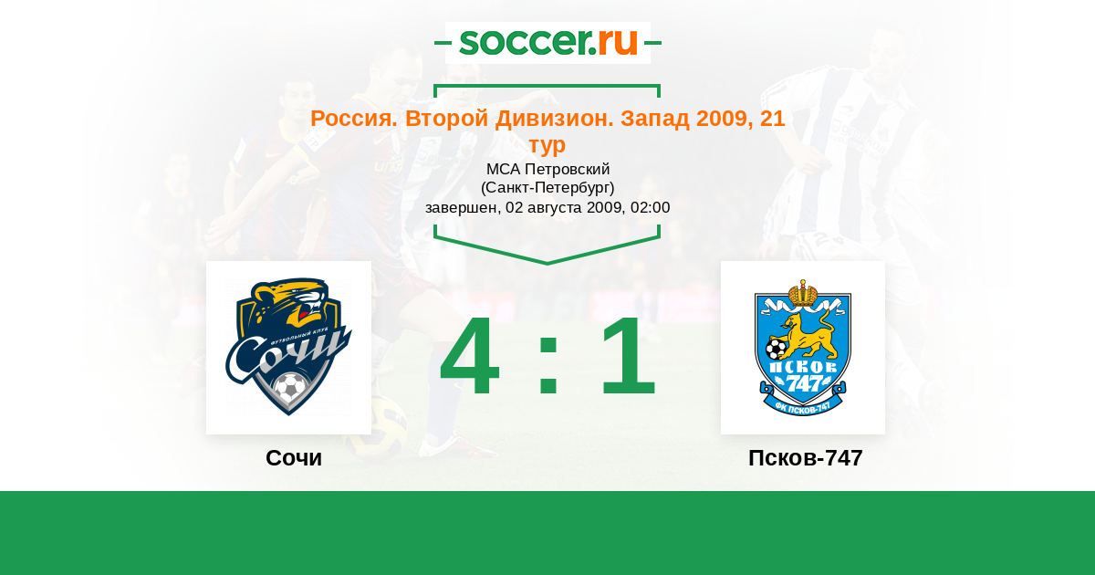 Россия. Вторая лига. Группа 2 18.04.2009 Псков-747 Логотип футбольный клуб Псков-747 0:3 Логотип футбольный клуб Динамо (Сочи) Динамо