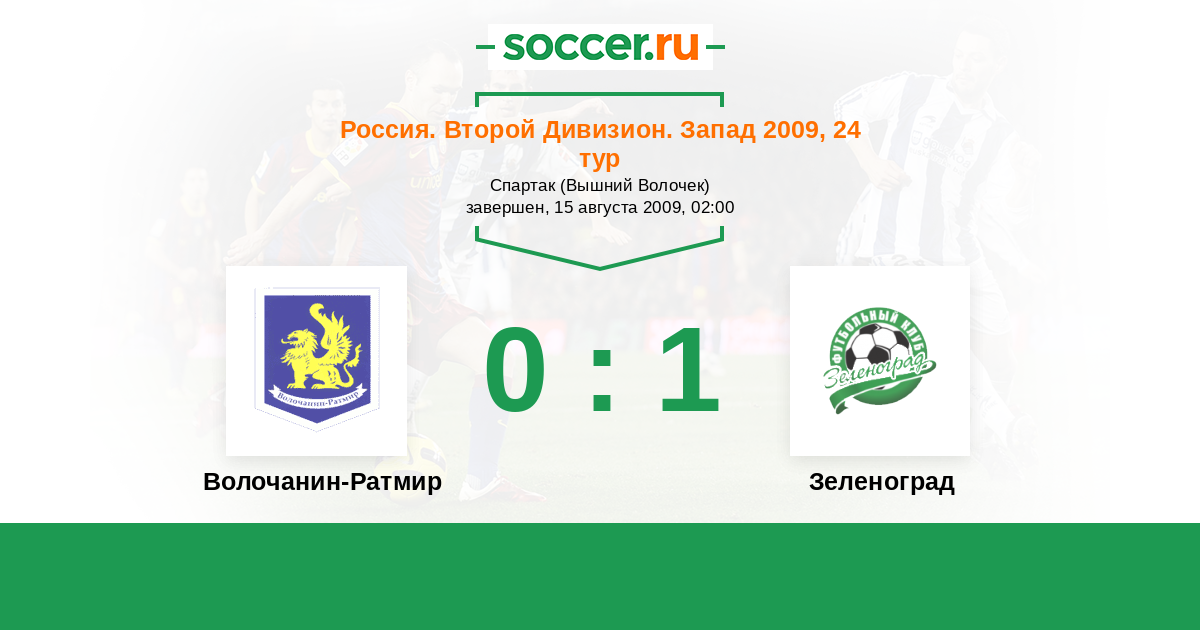 Россия. Вторая лига. Группа 2 02.05.2009 Зеленоград Логотип футбольный клуб Зеленоград (Москва) 0:2 Логотип футбольный клуб Волочанин-Ратмир (Вышний Волочек) Волочанин-Ратмир