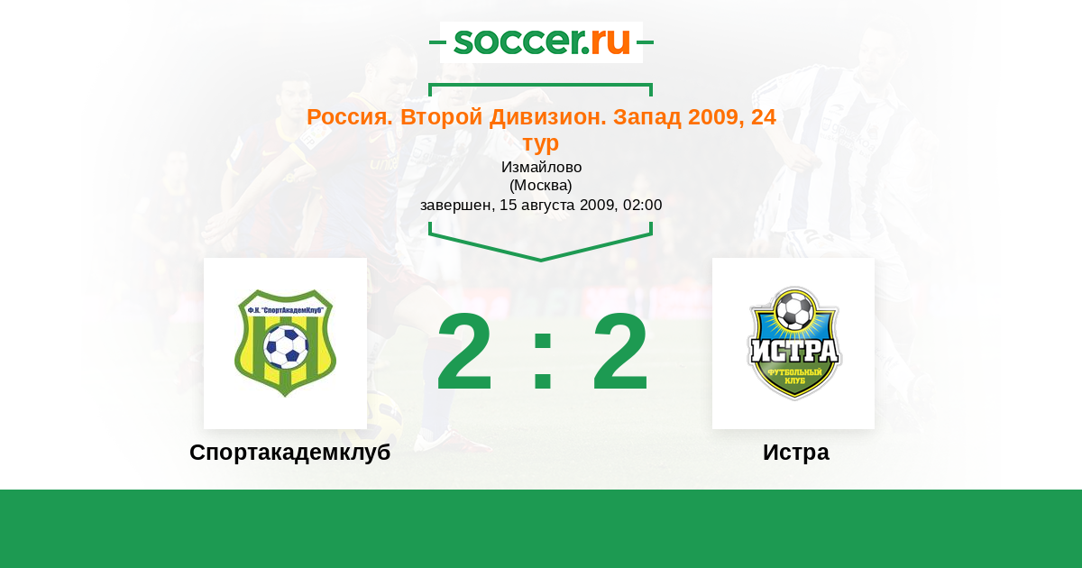Россия. Вторая лига. Группа 2 02.05.2009 Истра Логотип футбольный клуб Истра 1:0 Логотип футбольный клуб Спортакадемклуб (Москва) Спортакадемклуб