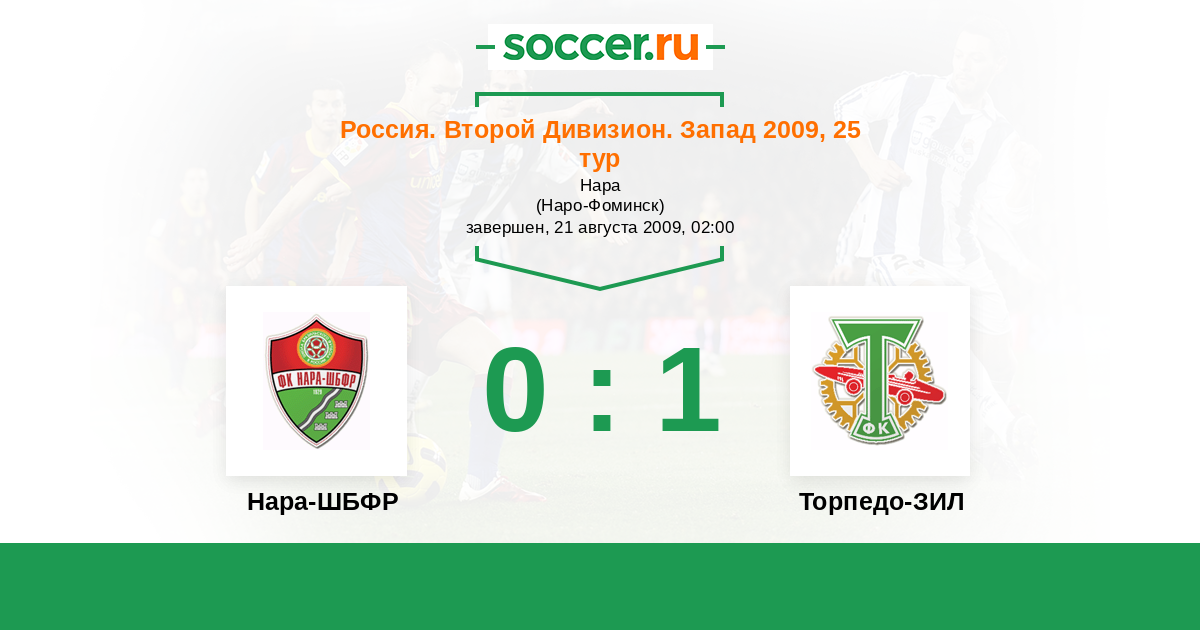Россия. Вторая лига. Группа 2 17.08.2010 Нара-ШБФР Логотип футбольный клуб Нара-ШБФР (Наро-Фоминск) 1:2 Логотип футбольный клуб Торпедо-ЗИЛ (Москва) Торпедо-ЗИЛ