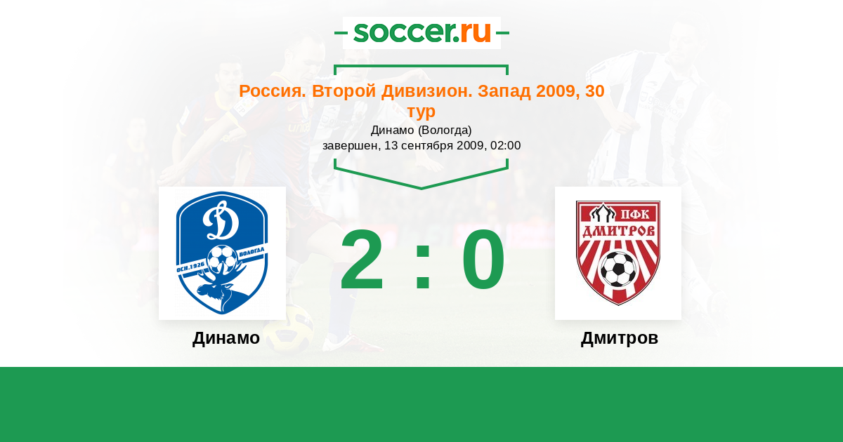 Россия. Вторая лига. Группа 2 01.06.2009 Дмитров Логотип футбольный клуб Дмитров 3:0 Логотип футбольный клуб Динамо Вологда Динамо Вологда