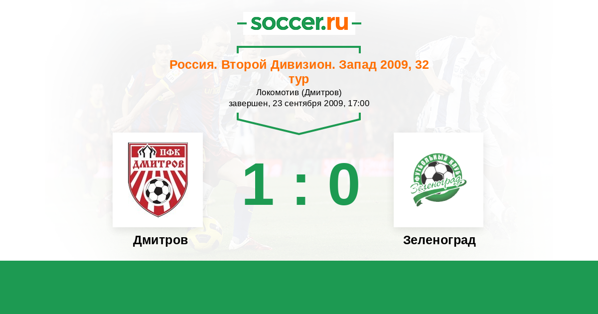 Россия. Вторая лига. Группа 2 23.09.2009 Дмитров Логотип футбольный клуб Дмитров 1:0 Логотип футбольный клуб Зеленоград (Москва) Зеленоград